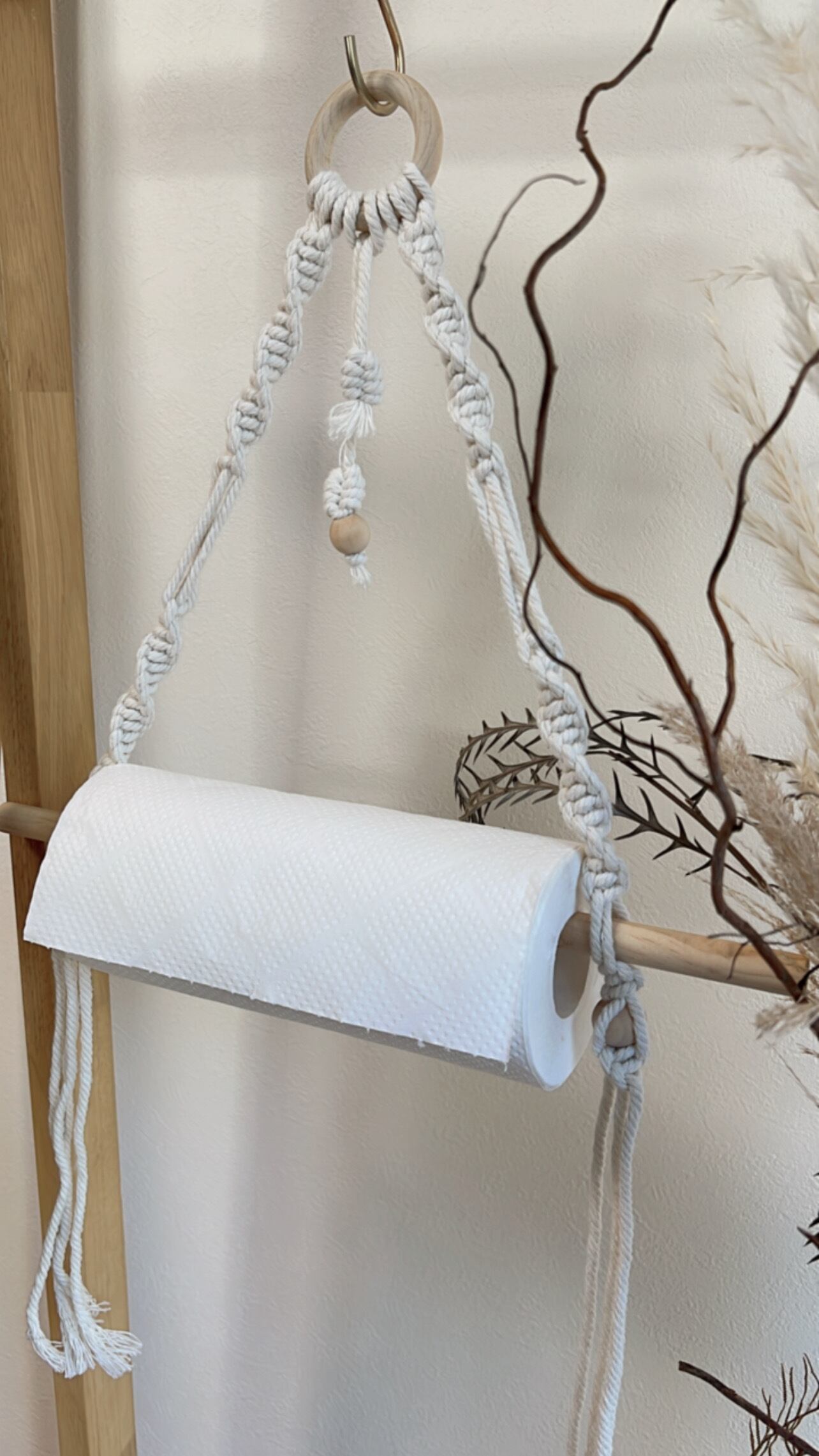 手作りのマクラメ編みが素敵なキッチンペーパーハンガー。使い捨てのペーパータオルをきれいに収納でき、同時にキッチンやダイニングのアクセントにもなります。