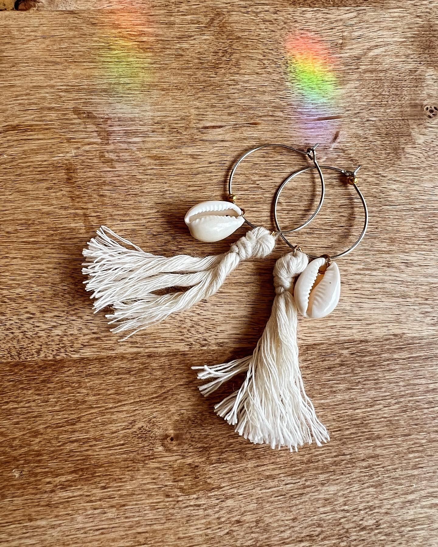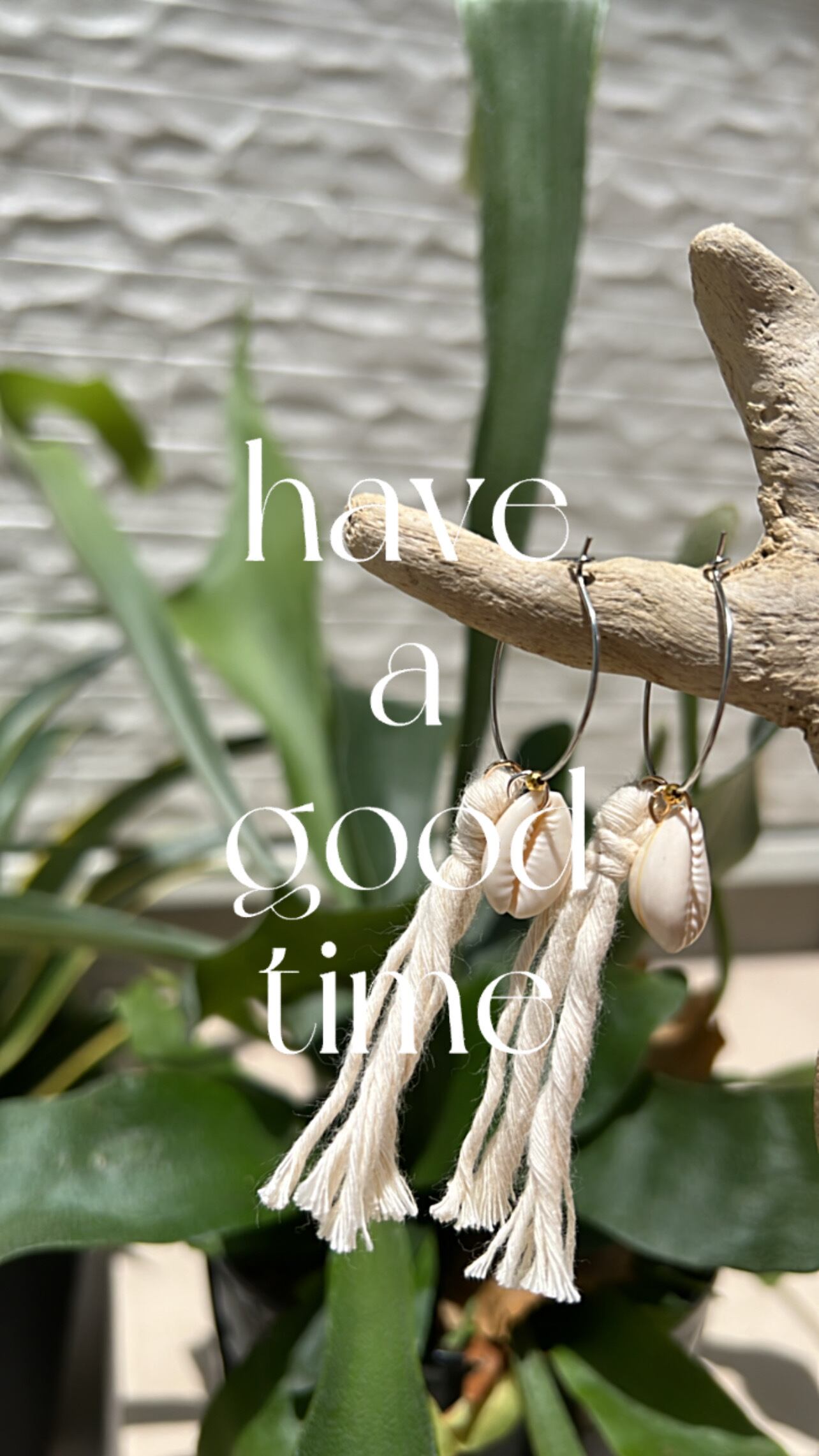 シェルとマクラメタッセルの組み合わせがアクセントになる、上品なタッセルピアスです。オーガニックコットンを使用しているので、肌に触れても安心です。