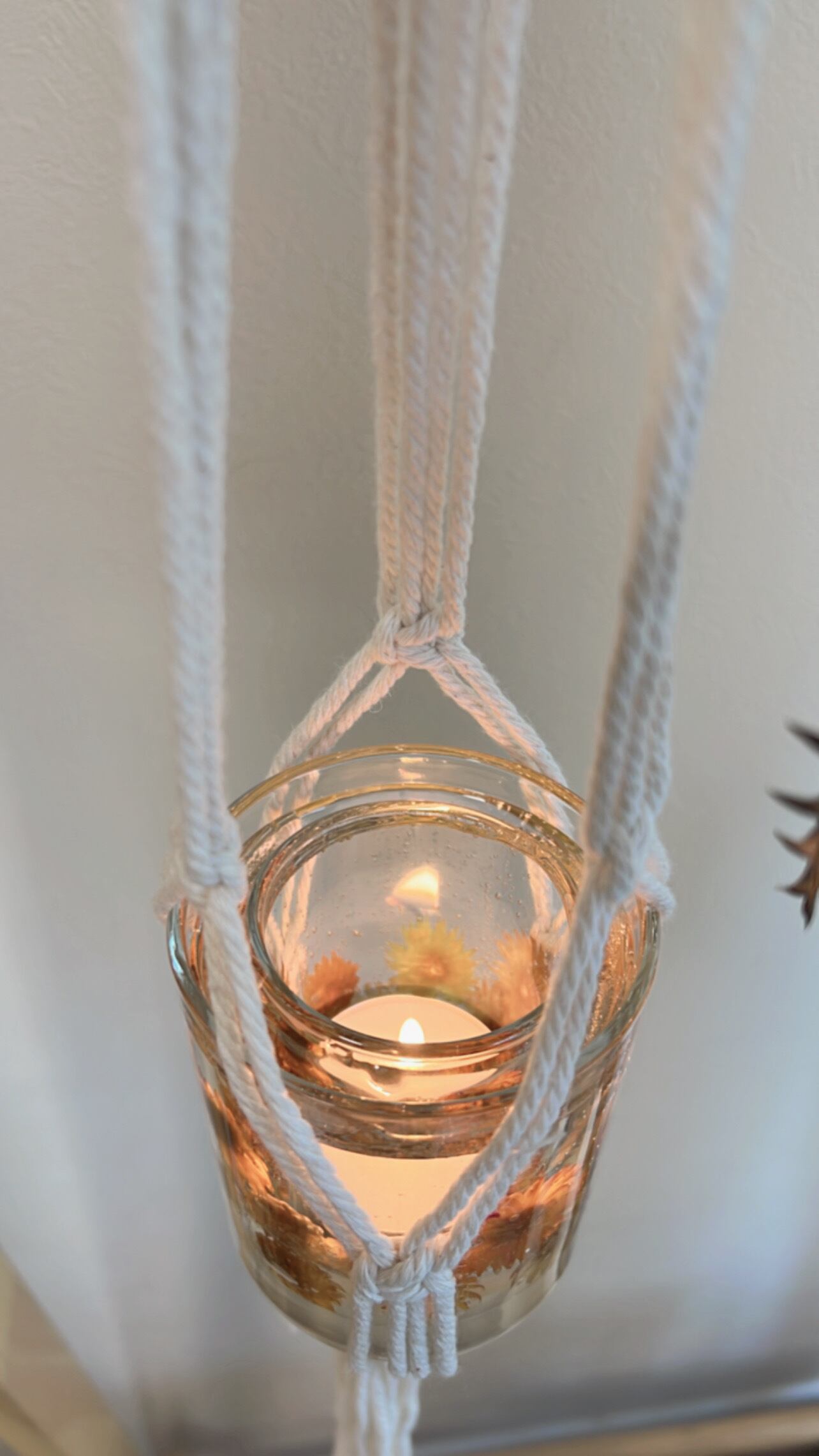ナチュラルでおしゃれなプラントハンガーデザインに、華やかな黄色のフラワーキャンドルが付いたセット。