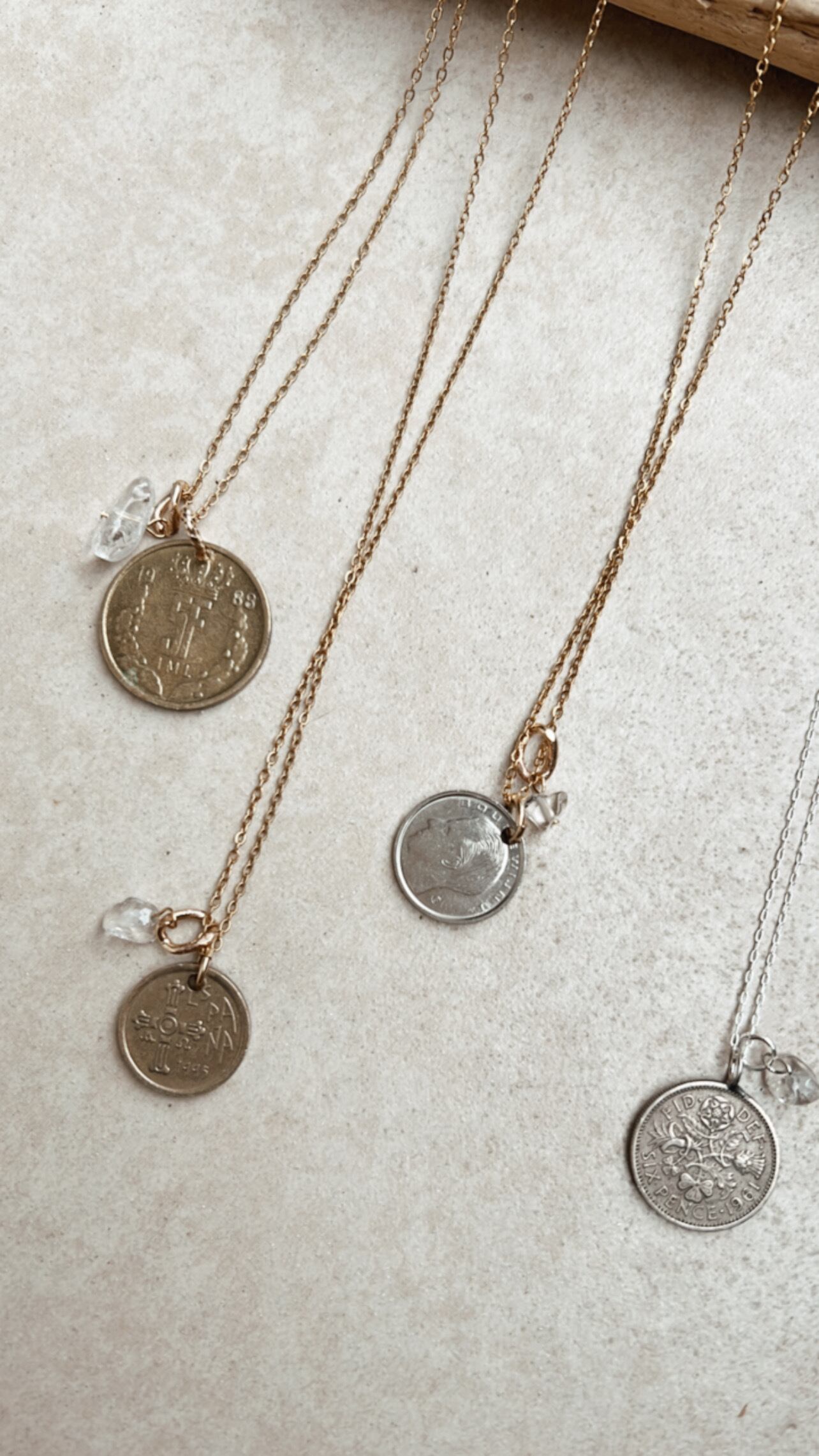 珍しい素材が融合したメダルネックレス。昔使われていた外国のコインとクリスタルが絶妙に調和し、存在感のあるネックレスに仕上げました。金属アレルギーの方でも安心なサージカルネックレス仕様で、敏感肌の方にも優しいアイテムです。
